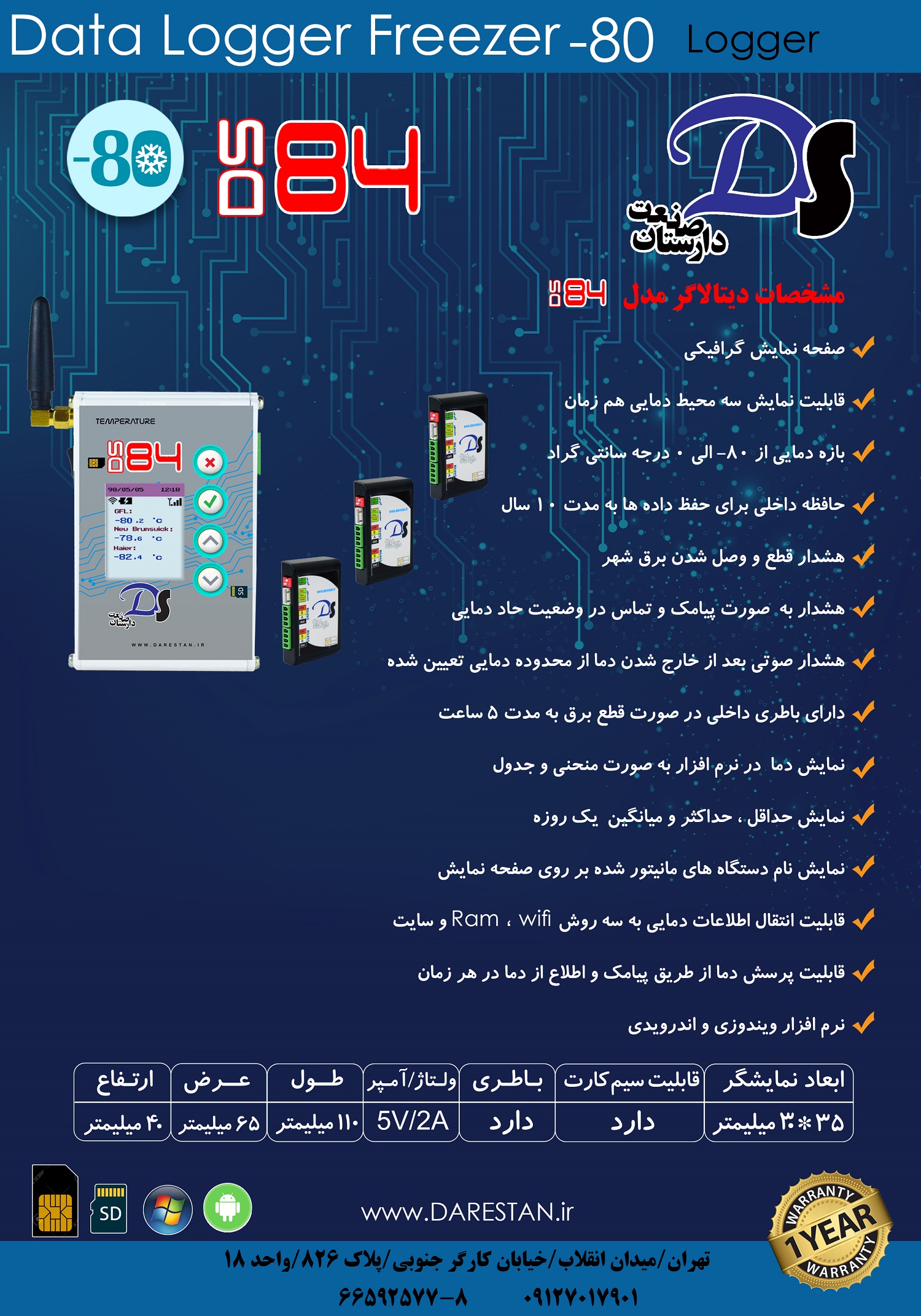 با دستگاه دیتالاگر مدل DS84 دارستان صنعت میتوان مانیتورینگ و نظارت کاملی بر شرایط و دمای فریزر های فوق سرد منفی ۸۰ درجه داشت. همچنین میتوان بصورت منظم گزارش مستند تهیه نمود.