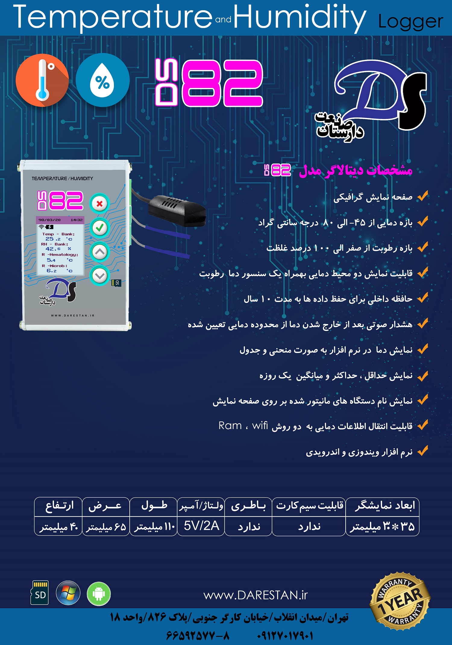 - دستگاه مدل DS82 پلاس دارای دو سنسور دما و رطوبت .