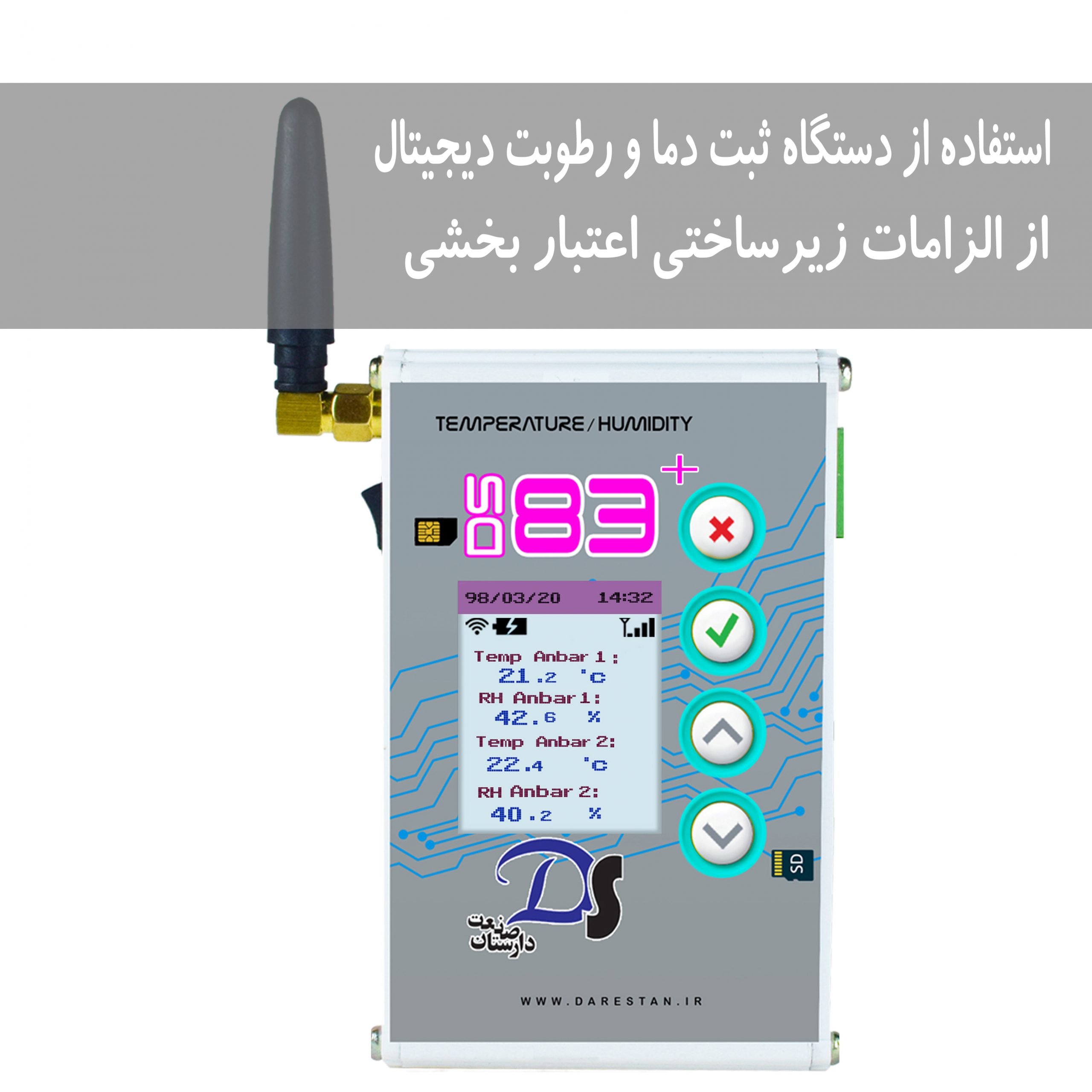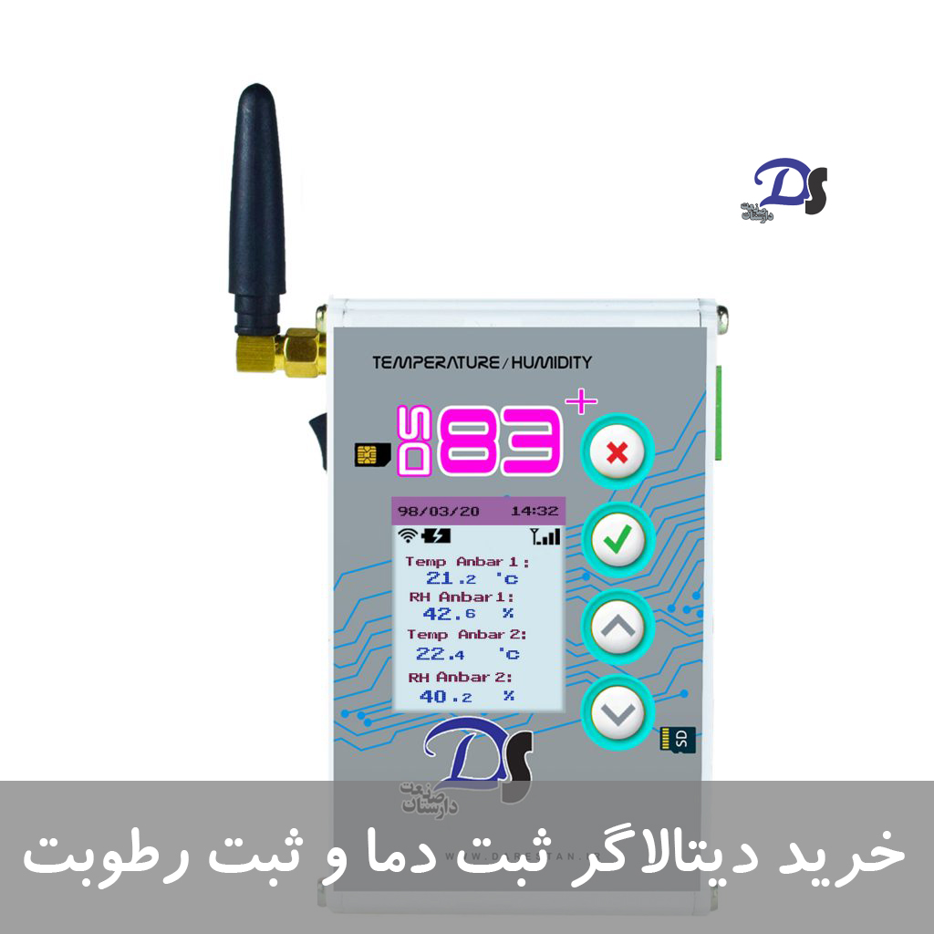 - دستگاه مدل DS83 پلاس دارای دو سنسور دما و رطوبت میباشد. این دستگاه قابلیت ارسال گزارش بصورت پیامک و سیستم اعلان خطر پیامکی می باشد. ضمن اینکه این دستگاه قابلیت ارسال داده ها از طریق اینترنت را نیز دارا میباشد.