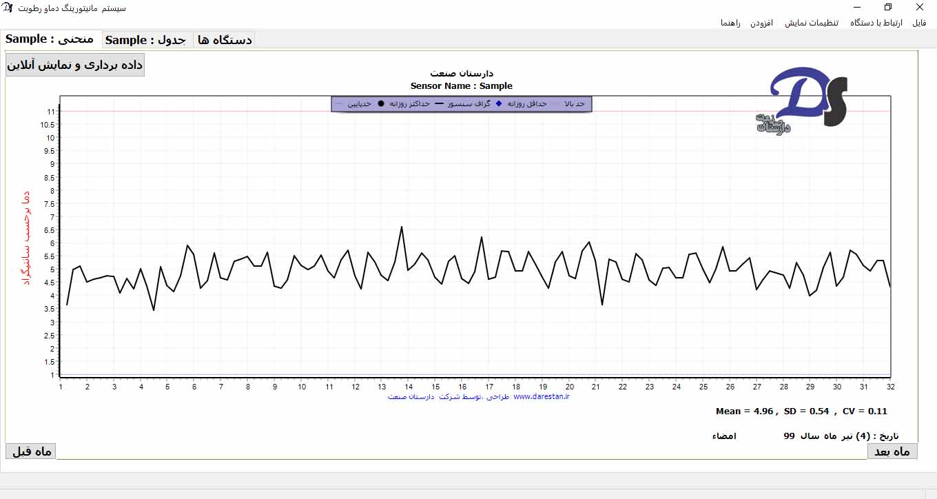 ازین رو می بایست به طور مستمر در فواصل زمانی مختلف دما را اندازه گیری کرد و بر تغییرات دمایی آن کنترل کامل داشت. ترموگراف دما دارستان صنعت مدل DS81 قابلیت اندازه گیری دما با ۴ سنسور را دارد.